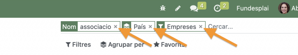 Pots aplicar filtres i agrupacions conjuntament i aquests es representen com a etiquetes a la barra de cerca. Pots desactivar-los clicant al símbol X del final de l’etiqueta.