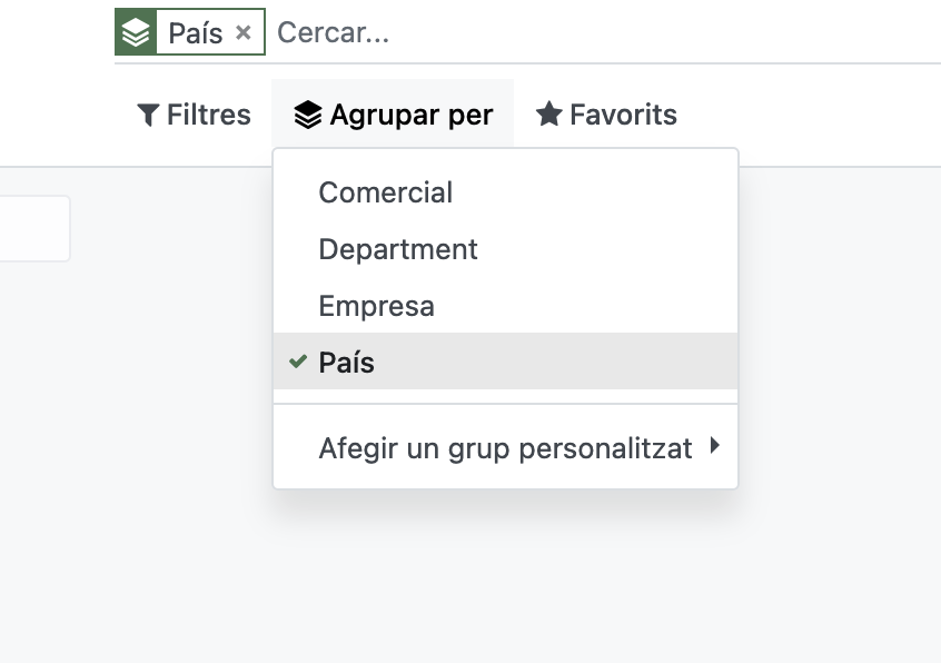 Pots fer clic al botó Agrupar per sota del camp de cerca per agrupar els registres a partir d’un grup preconfigurat o crear agrupacions personalitzades d’una forma semblant a com has fet servir els filtres anteriorment.