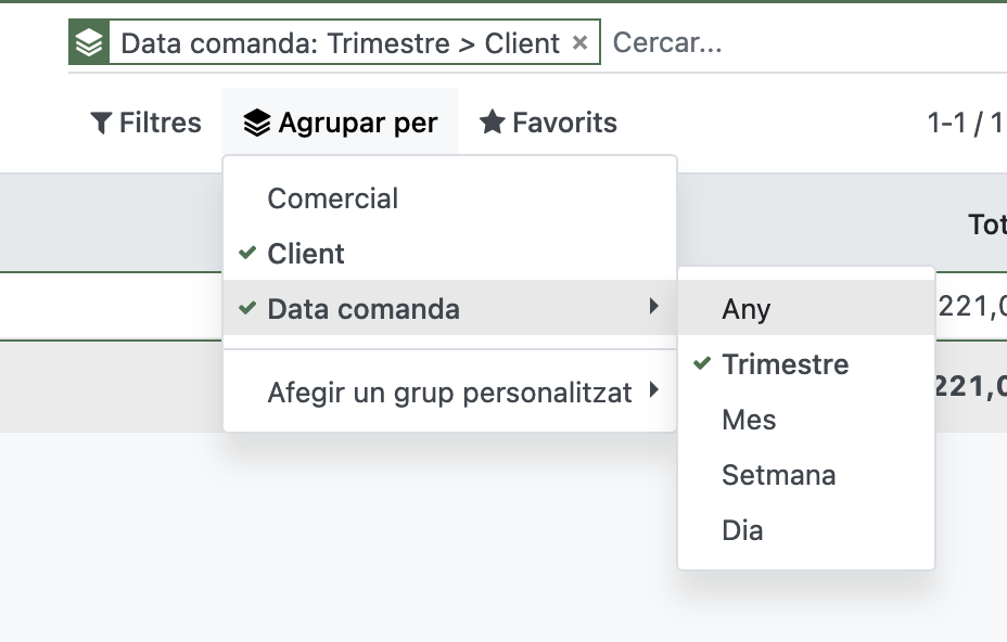 Pots utilitzar agrupacions recurrents. El primer grup que seleccionis serà el primer nivell d’agrupament, el següent que afegeixis generarà subgrups a partir del segon criteri i així successivament. Per exemple, podem agrupar comandes per trimestre i dins de cada trimestre agrupar-les per client.