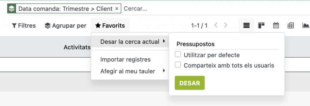 Els filtres i agrupacions aplicats —preconfigurats o personalitzats— desapareixen quan surts de la vista en la qual han estat creats. Si els vols conservar per a aplicar-los en el futur, les pots guardar dins el botó Favorits amb l’opció Desar la cerca actual, anomenant la cerca i clicant al botó Desar. També disposes de l’opció d’utilitzar-los per defecte sempre que entris a la vista (Utilitzar per defecte) o també compartir-los amb la resta d’usuaris de la teva organització (Comparteix amb tots els usuaris).