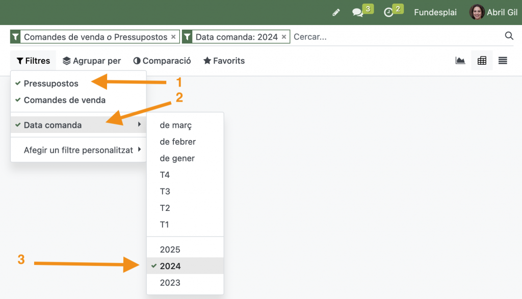 Per exemple, a l’aplicació Vendes trobaràs un informe d’Anàlisi de vendes on, per defecte, només es mostren els registres en la fase de Comanda de venda. Tanmateix, pots incloure també registres en la fase de Pressupost seleccionant Pressupostos. A més, es poden filtrar els registres d’un any concret, per exemple 2024, seleccionant Data de comanda->2024