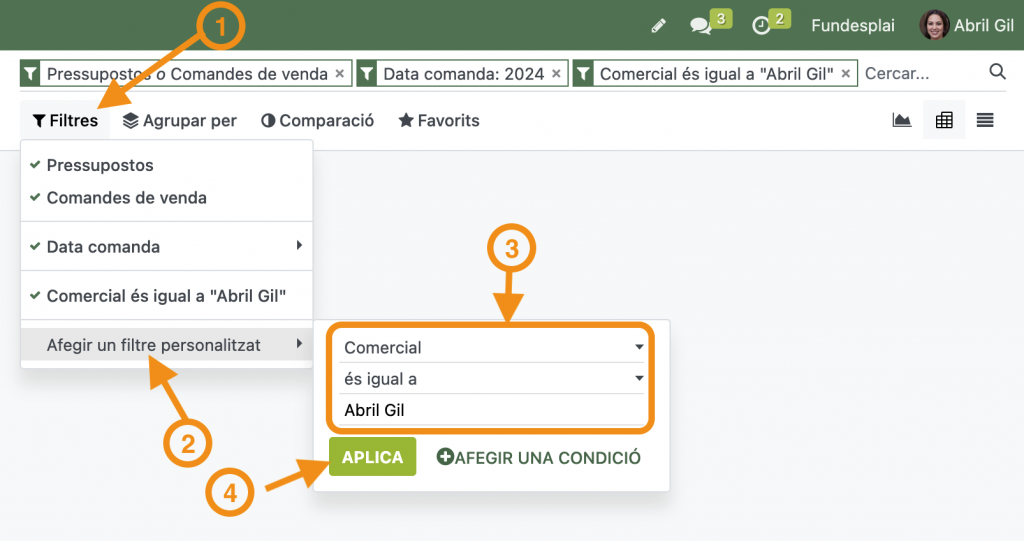 Pots crear filtres personalitzats fent servir la majoria dels camps presents al model fent clic a Filtres → Afegeix un filtre personalitzat. Seguidament, selecciona un camp, un operador i un valor i, finalment clica a Aplica.