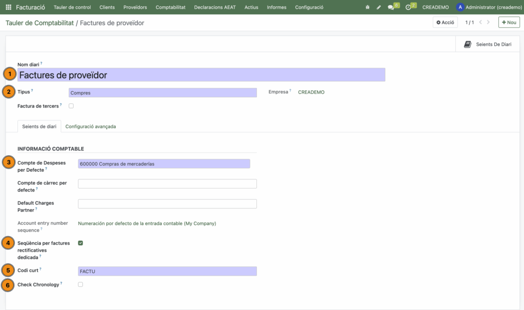 Els diaris de compres serveixen per a registrar les compres de productes o de serveis necessaris per al funcionament de la teva entitat i gestionar el seu pagament així com el pagament de despeses. Els camps més importants en la configuració d’aquest tipus de diari són: