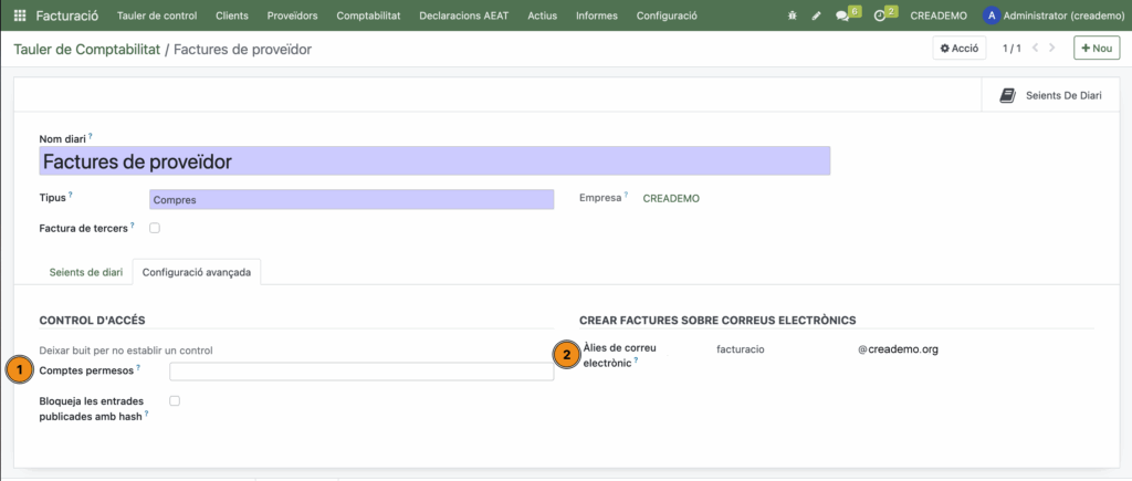 Pots configurar un àlies del correu d’entrada del CreaERP per a registrar factures de proveïdor. Pots proporcionar aquesta adreça perquè els teus proveïdors enviïn directament les seves factures al teu diari de factures de proveïdor.
