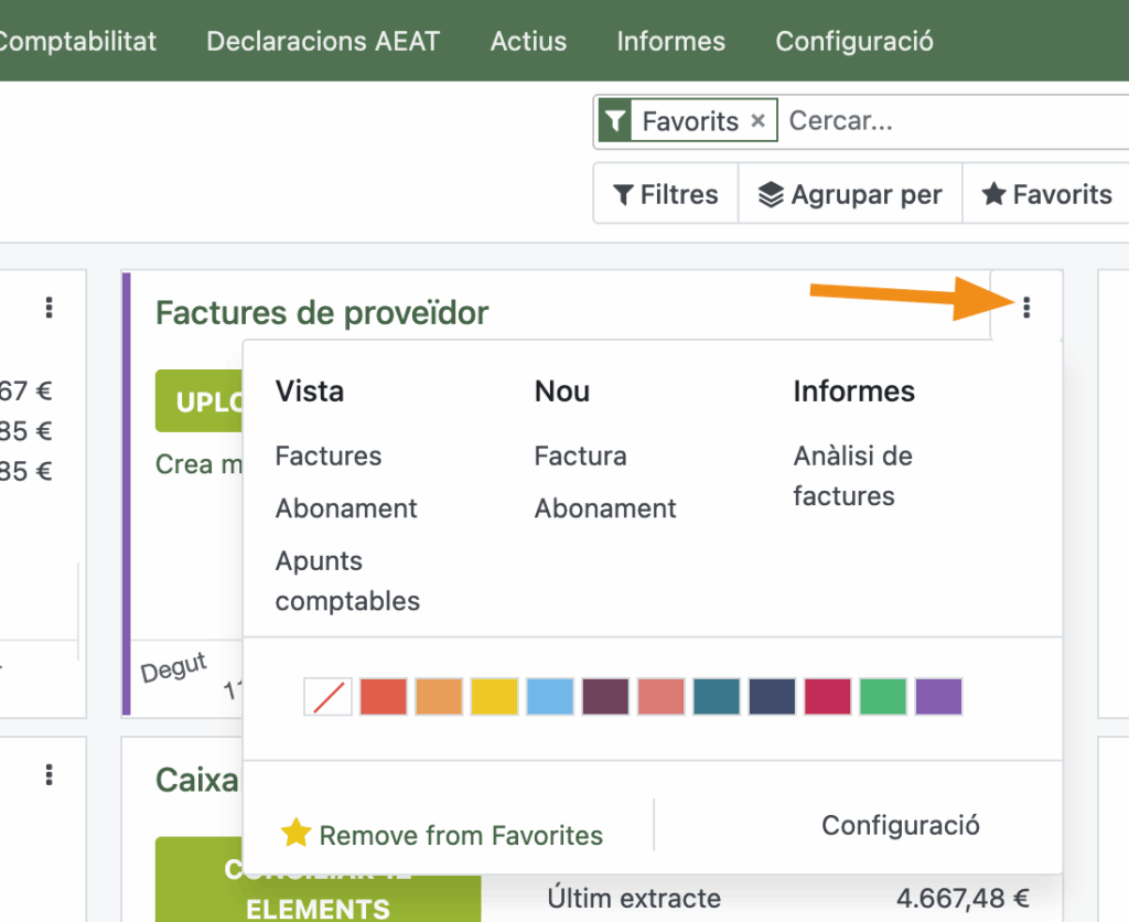 Per a accedir a aquestes a altres funcions addicionals, pots clicar als tres punts verticals de l’extrem dret de la targeta. Les trobaràs agrupades en Vista (consultes), Nou (creació de noves factures) i Informes. També podràs marcar el diari com a favorit i accedir a la configuració que hem vist anteriorment.
