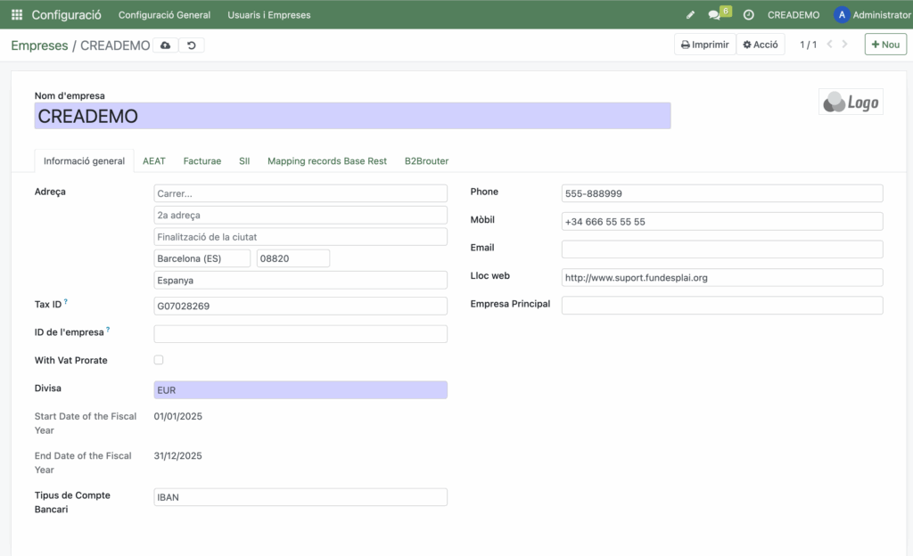 Si tens permisos de Configuració podràs accedir a Configuració→Configuració general →Gestionar empreses. I accedir a la configuració de dades relacionades amb la facturació i la comptabilitat a través de les diferents pestanyes: