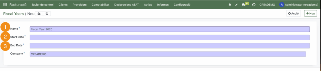 CreaERP et permet crear, anomenar i editar els períodes fiscals. Accedeix des de Facturació->Configuració->Comptabilitat.-> Fiscals years i prem el botó Nou