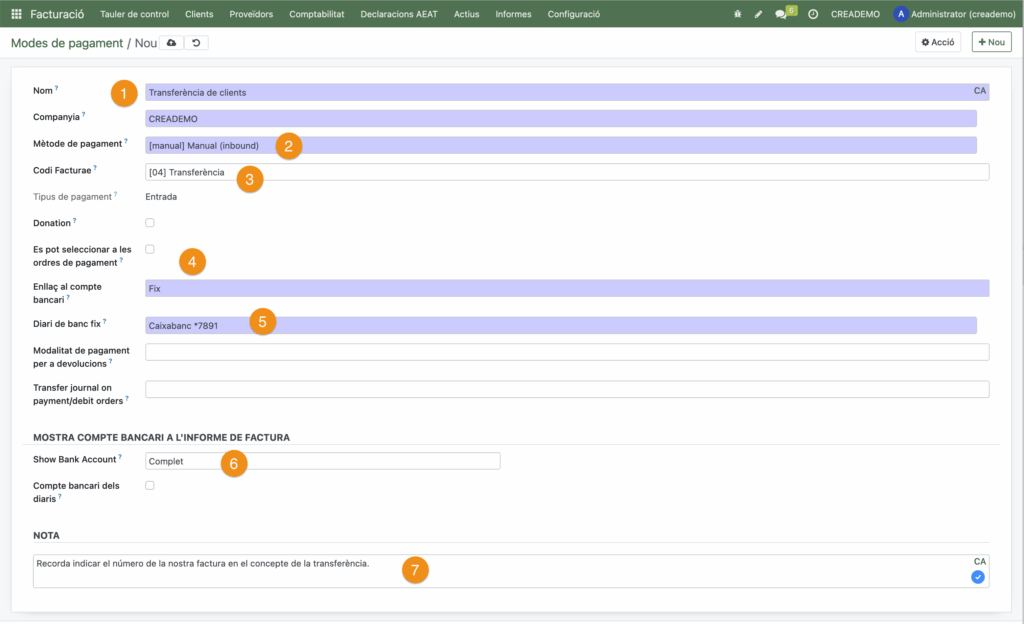 7. Nota. Aquí pots afegir informació addicional que s’inclourà en la factura per ajudar el client a efectuar el pagament.