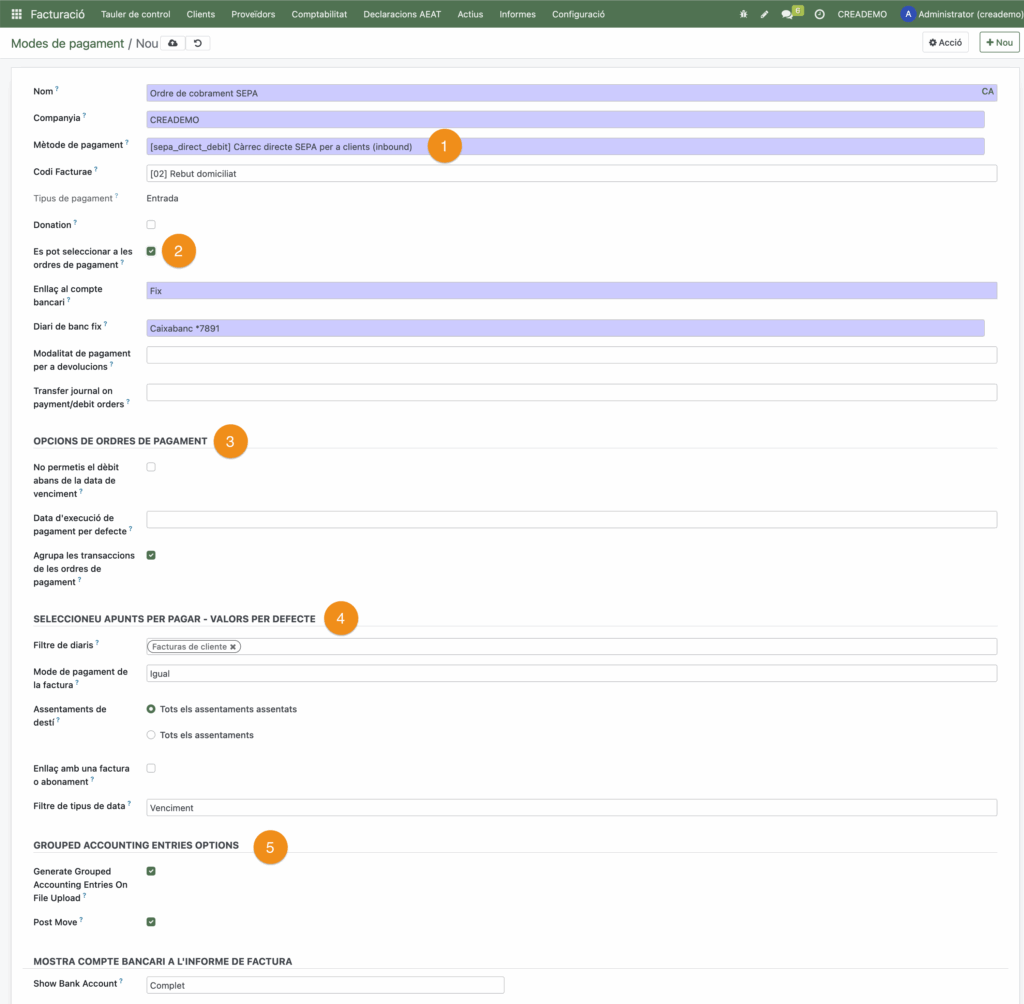 2. Es pot seleccionar a les ordres de pagament. Activa aquest camp perquè es pugui triar aquest mode des de les ordres de pagament/cobrament. Això farà que apareguin noves seccions a la configuració del mode de pagament.