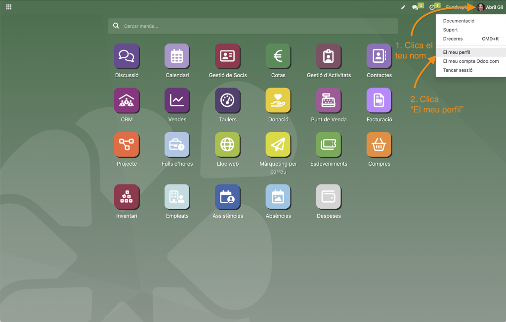 Quan accedeixis a la instància de la teva organització, pots modificar algunes opcions relatives al teu usuari de CreaERP. Aquestes modificacions es poden dur a terme des de El meu perfil. Pots accedir clicant la icona amb la teva imatge i/o el teu nom que es troba a l’extrem dret de la barra de control de CreaERP.