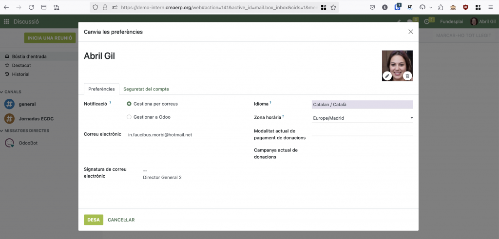 Pots canviar el correu electrònic que fas servir per a accedir a CreaERP