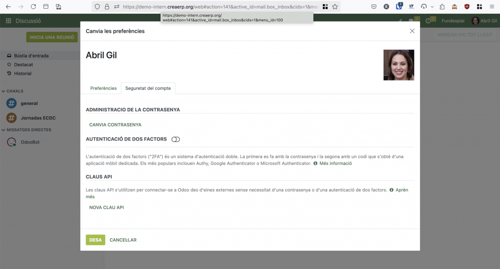 Només modifiqueu les opcions Autentificació de dos factors i Claus API per indicació i/o ajuda de l'administrador de la instància de CreaERP de la vostra organització.