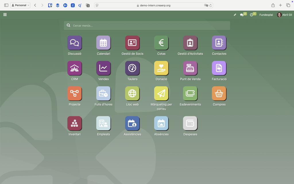 Les funcionalitats de CreaERP s’agrupen en mòduls funcionals (de vegades també s’anomenen Aplicacions). Quan hagis accedit a la plataforma amb el teu usuari i contrasenya veuràs una pantalla similar a aquesta: