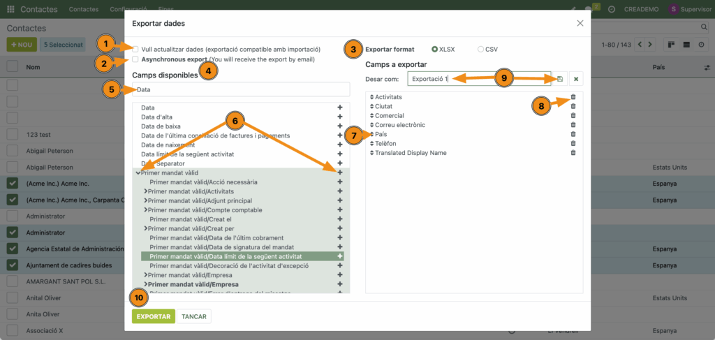 CreaERP permet exportar amb dos formats: CSV (caràcters separats per comes) i Excel. És recomanable fer servir aquesta segona opció per mantenir els formats dels camps especials com dates o números. - Camps disponibles.