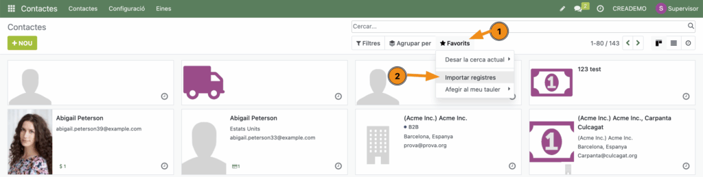 Obre la vista del model al qual vols importar dades i clica a Favorits ‣ Importar registres.