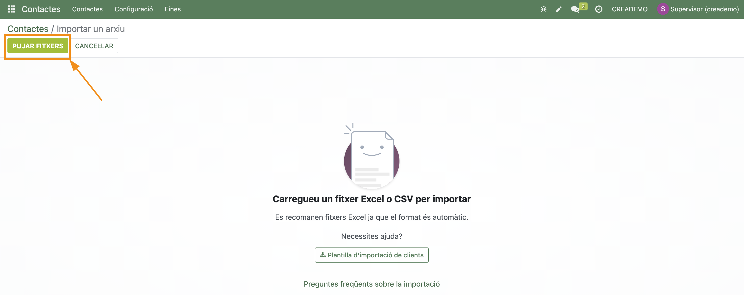 Per a executar la importació de les dades clicarem al botó Pujar fitxers i enviarem l’arxiu al nostre CreaERP.