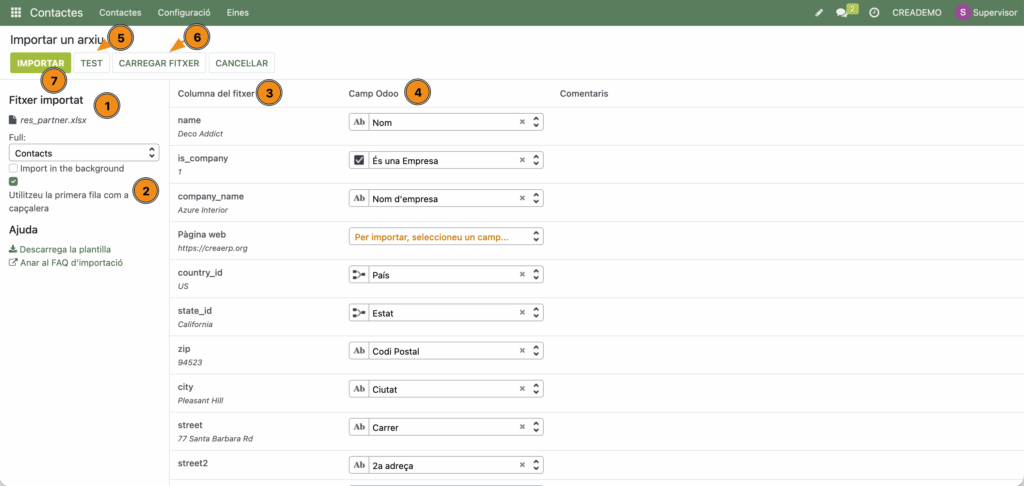 Si l’arxiu que pugem és la plantilla que hem baixat del CreaERP, ja tindrem el mapatge dels camps emparellats. En cas de pujar camps no existents a la plantilla o sense capçalera aquí haurem de definir la correspondència de camps del full de càlcul a la base de dades de CreaEP