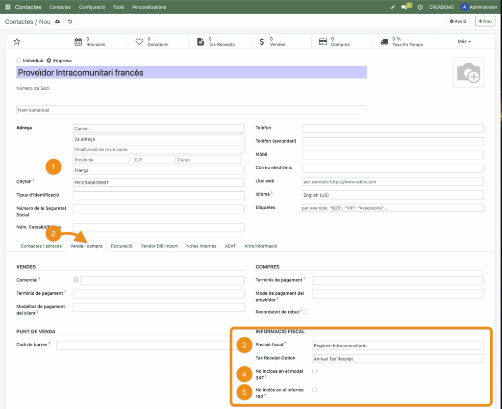 - Assigna la posició fiscal corresponent. CreaERP incorpora les posicions fiscals definides per l’AEAT de forma que hauràs de triar l’opció correcta per al teu proveïdor/client segons el seu règim fiscal. En cas de no estar informat CreaERP interpretarà que la posició fiscal del client/proveïdor és Règim Nacional.