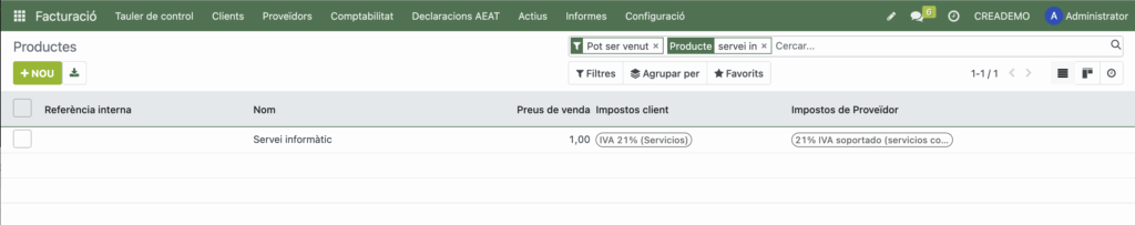Quan creïs un producte per a ser comprat o venut, cal que li assignis els impostos corresponents com si el client/proveïdor té assignada la posició fiscal ‘Règim nacional’