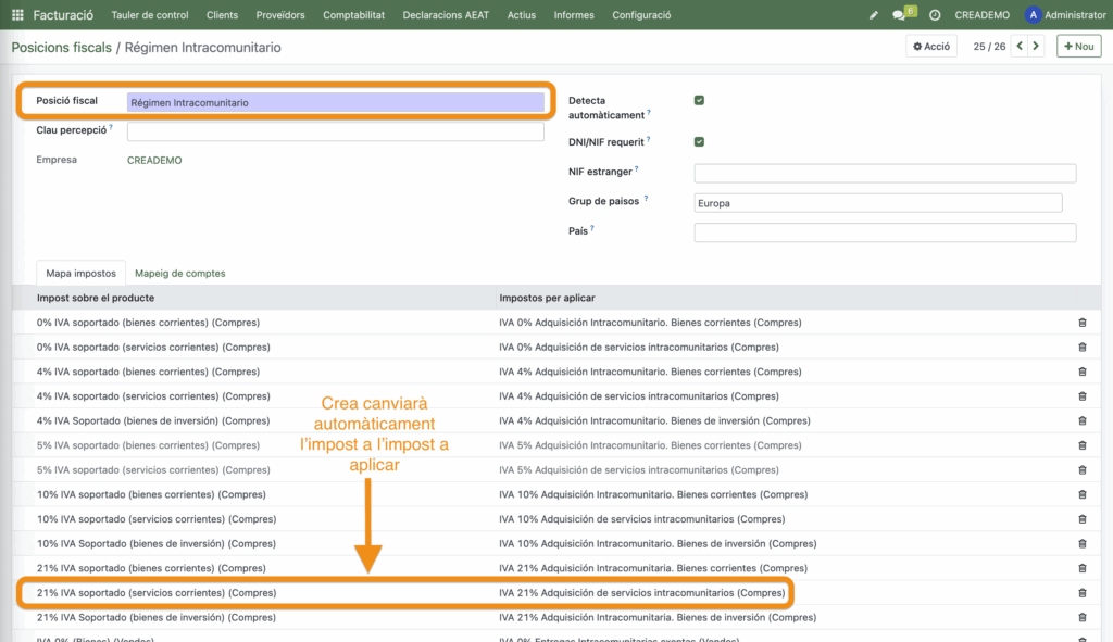 En el cas que compris aquest producte, per exemple, a un proveïdor amb Règim Intracomunitari, CreaERP adequarà l’impost aplicat d’acord amb una taula definida a la configuració de la posició fiscal.