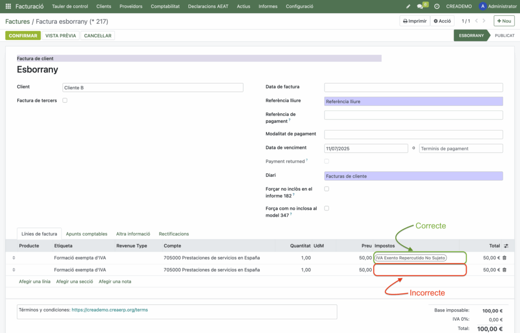 La vinculació de l’assentament amb els informes es fa a través dels impostos aplicats a cada línia de la factura Per exemple, en el cas de la compra/venda d’un servei exempt d’IVA, no s’ha d’eliminar l’impost de la línia de factura. Haurem de mantenir m’impost d’exempció ‘IVA corresponent.