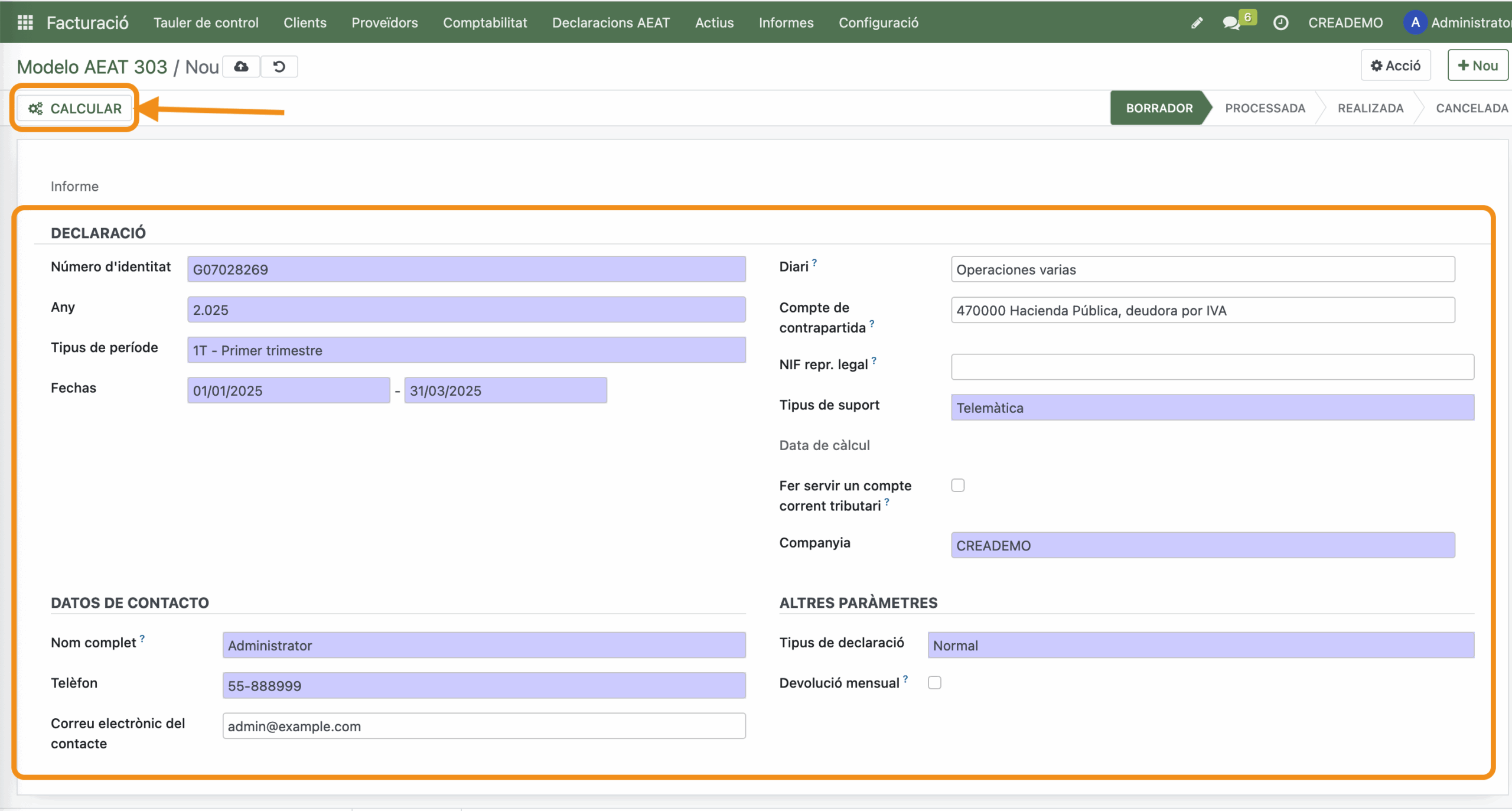 Defineix els paràmetres de la declaració i prem el botó calcular. CreaERP revisarà tots els assentaments comptables del període demanat i calcularà el resultat a partir de les dades actuals.