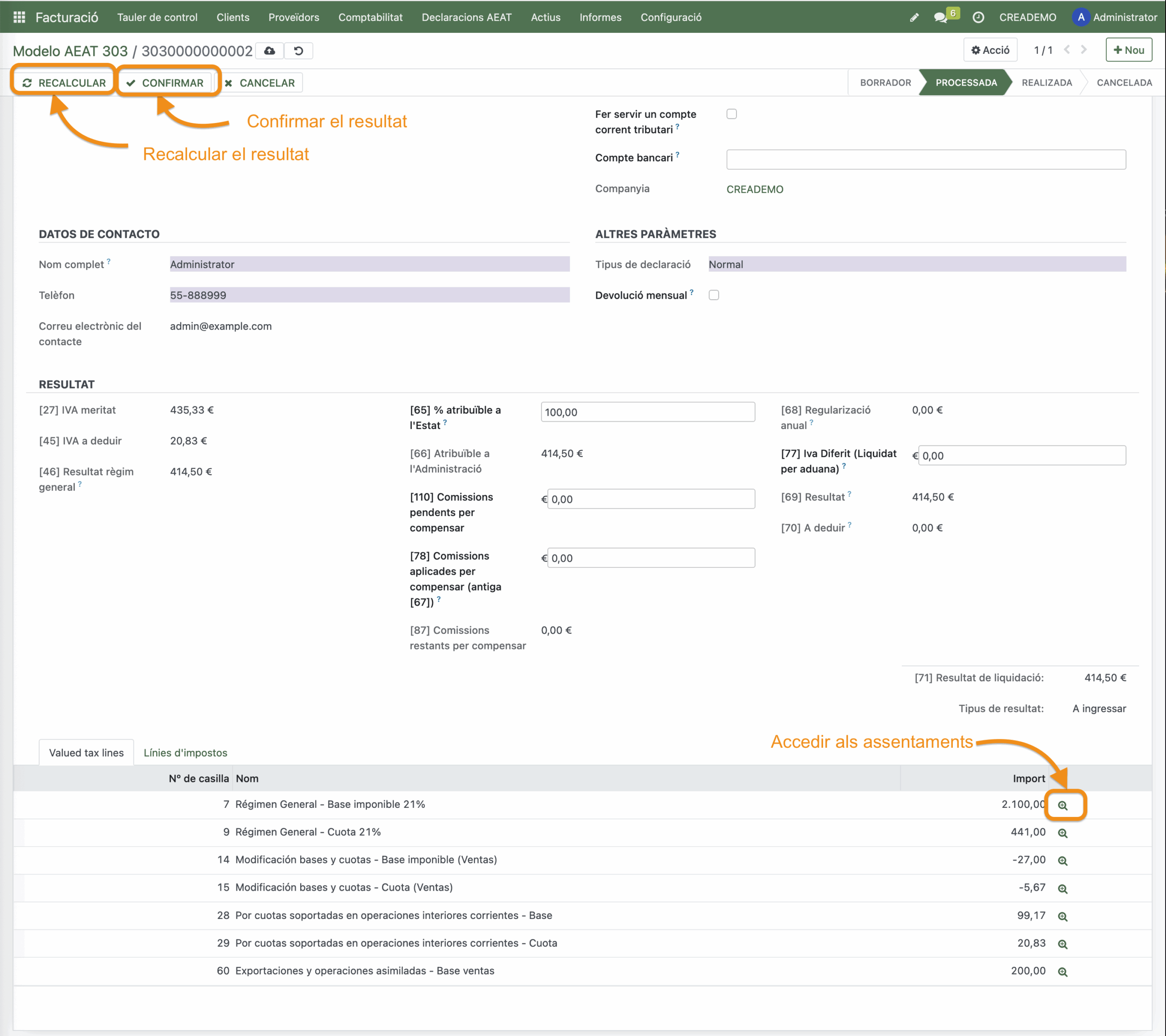 La declaració canviarà el seu estat d’Esborrary a Processada i CreaERP mostrarà el resultat provisional. Pots revisar els assentaments que originen el resultat de cada casella prement la lupa contigua al valor del resultat. Si no estàs satisfet pots afegir, modificar o eliminar tots elements comptables que calgui dins la comptabilitat i tornar a calcular el resultat de la declaració amb el botó Recalcular. Una vegada satisfet, pots avançar amb el botó Confirmar.