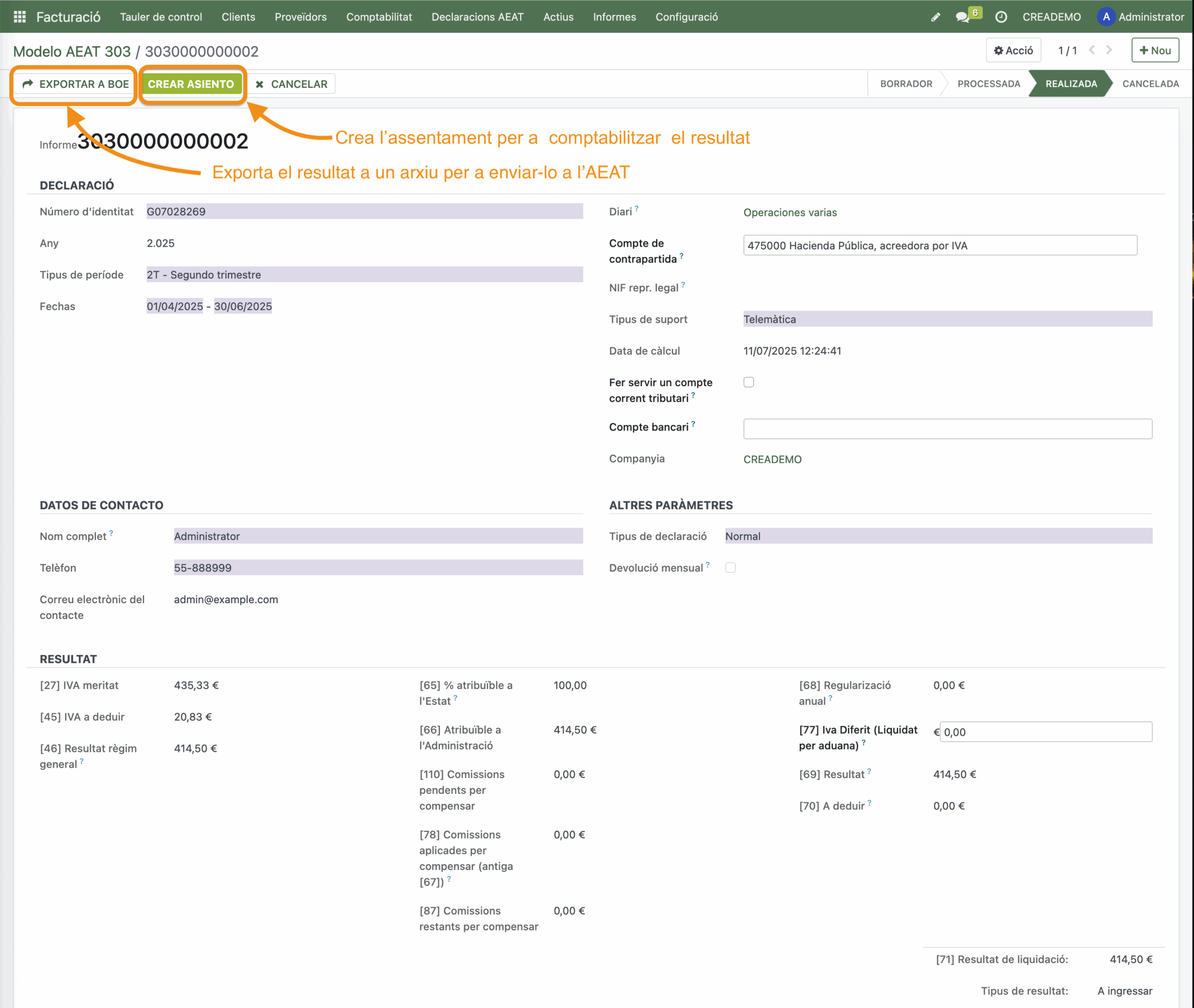 L’estat de la declaració passa de Processada a Realitzada. En prémer el botó Crear Asiento, es genera l’assentament comptable que reflecteix a la comptabilitat el resultat de la declaració. Amb el botó Exportar a BOE obtindràs un arxiu TXT compatible amb la pujada en línia de la pàgina web de l’AEAT.