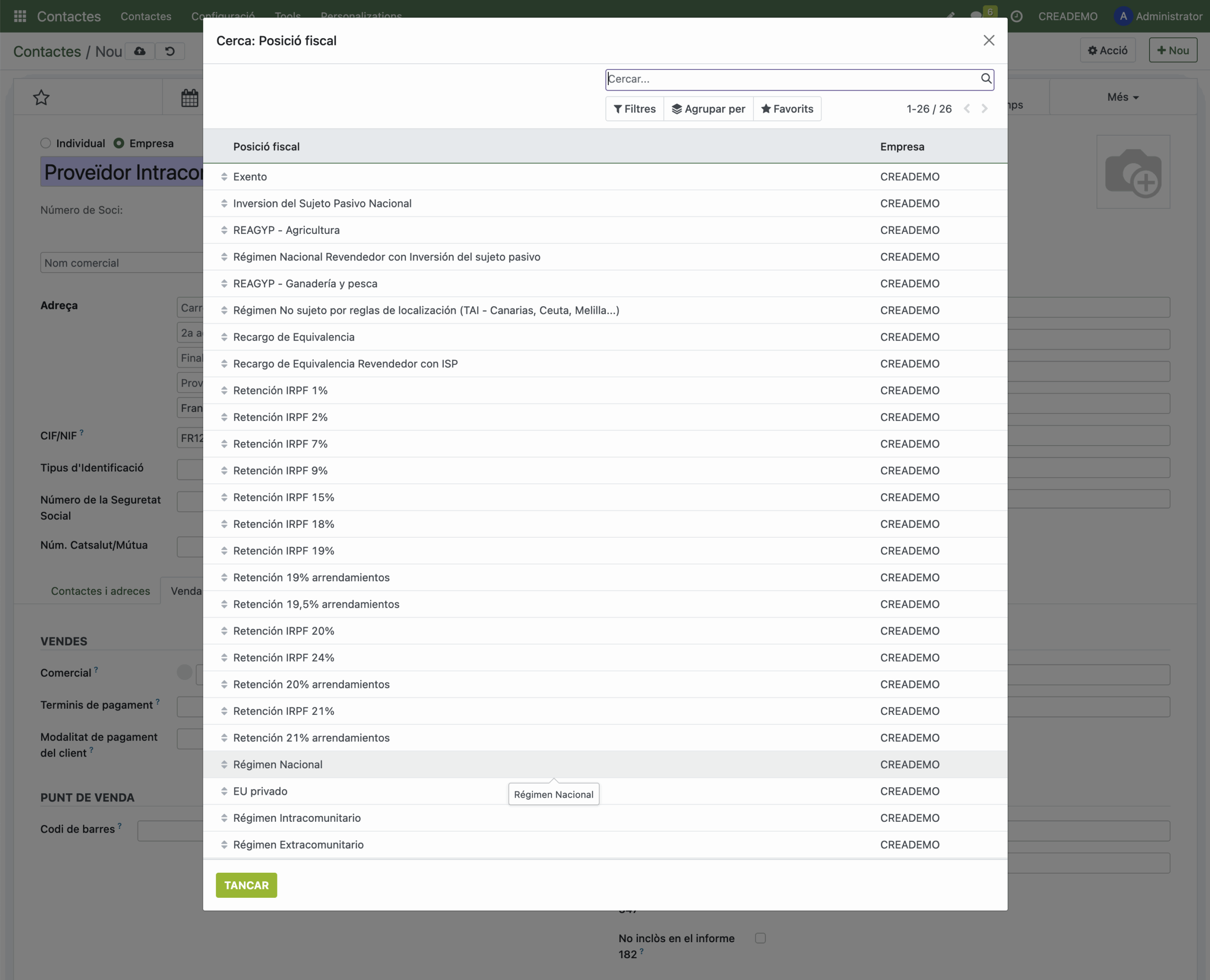 - Assigna la posició fiscal corresponent. CreaERP incorpora les posicions fiscals definides per l’AEAT de forma que hauràs de triar l’opció correcta per al teu proveïdor/client segons el seu règim fiscal. En cas de no estar informat CreaERP interpretarà que la posició fiscal del client/proveïdor és Règim Nacional.
