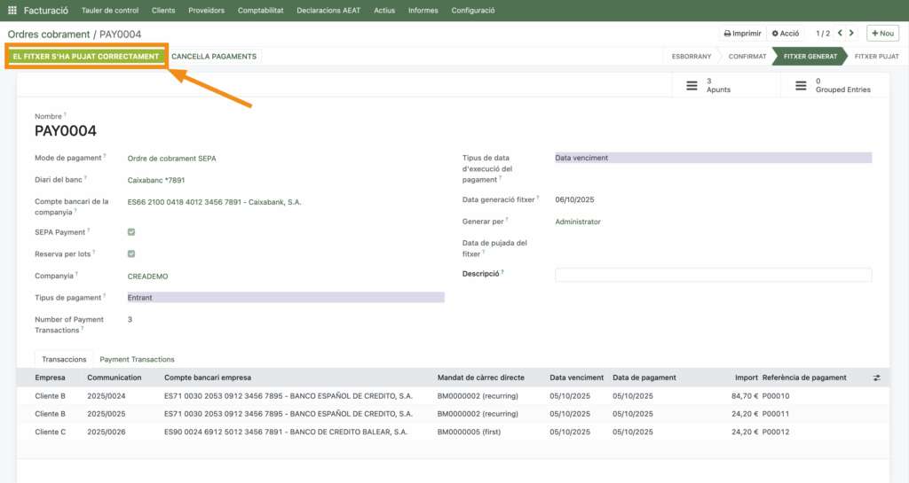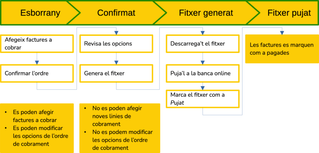 - Les factures incloses en l’ordre de cobrament, quedaran marcades com a pagades:
