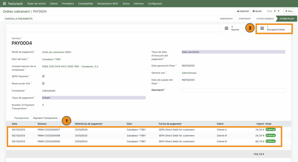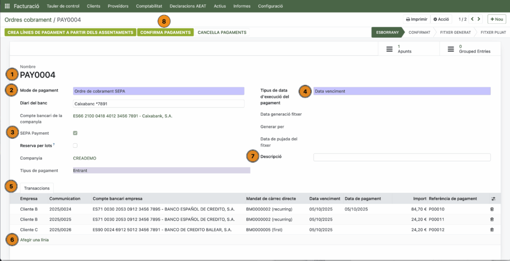 - Es generen els assentaments relacionats amb les transaccions de pagament, però aquestes queden en mode esborrany.