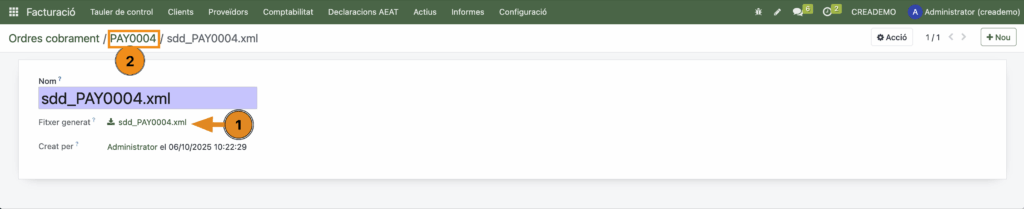 - Descarregar l’arxiu XML amb l’ordre de cobrament al teu ordinador