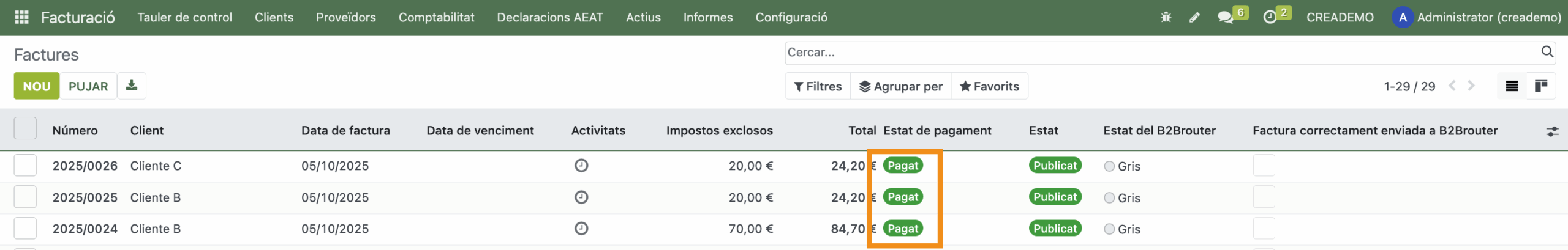 - Les factures incloses en l’ordre de cobrament, quedaran marcades com a pagades: