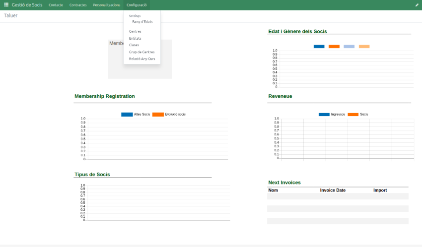 A part d’aquesta configuració, més de baix nivell, es poden trobar les configuracions de diferents agrupacions dels contactes al menú “Configuració” dins del mòdul de Gestió de Socis.