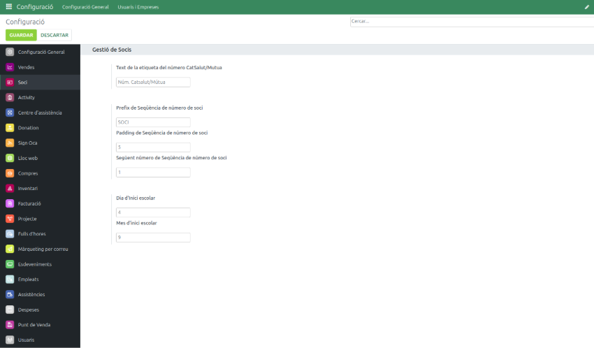Aquests paràmetres de configuració mostren algunes dades importants del Soci, com per exemple el codi de número de soci o en el cas d’activitats de tipus escolar, quan comença el curs escolar.