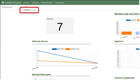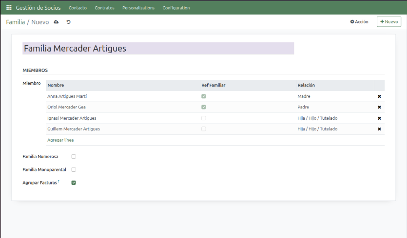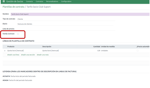 Finalment, al formulari de contracte, trobem un checkbox on es pot especificar si és un contracte de tipus familiar. Això implica que si un contacte el fa un soci mitjançant aquest tipus de contracte, tots els integrants del grup familiar també queden associats al contracte. Per tant, també estaran registrats com a socis, amb el mateix número de soci que el contacte que s’ha fet soci originalment.