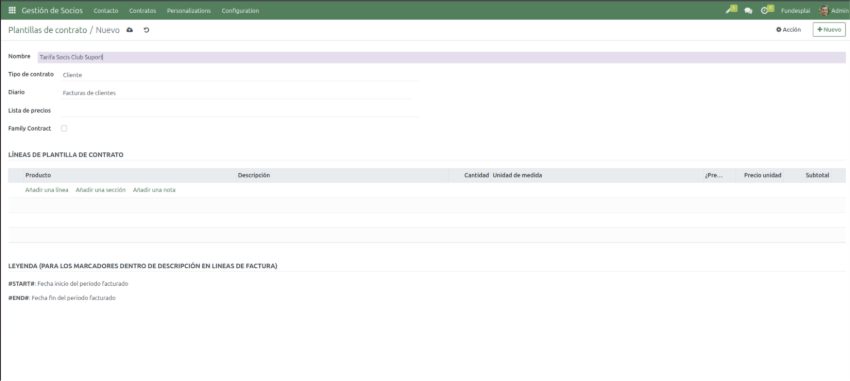 Per defecte al mòdul de Gestió de Socis > Contractes hi ha una plantilla de contracte definida que es pot fer servir com a exemple.
