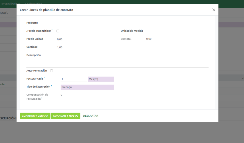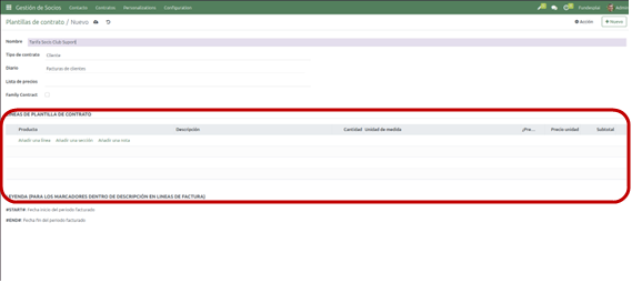 En afegir una línia de plantilla apareixerà un formulari on podrem definir el producte associat (per ex., Quota), un preu unitari del producte, una quantitat, etc. (molt similar a les línies de factura). També podem deixar definit tots aquests paràmetres a nivell de producte (com les factures).