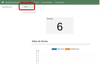 Per tal d’accedir a la creació d’un nou soci, cal entrar al menú “Contacto” > “Socis”, com mostra a la captura.