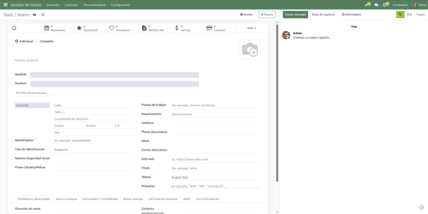 Aquest menú ens portarà a la llista de socis d’on en podrem crear un de nou pitjant al botó “Nou”. Aquesta acció ens portarà a la fitxa de contacte (encara no Soci).