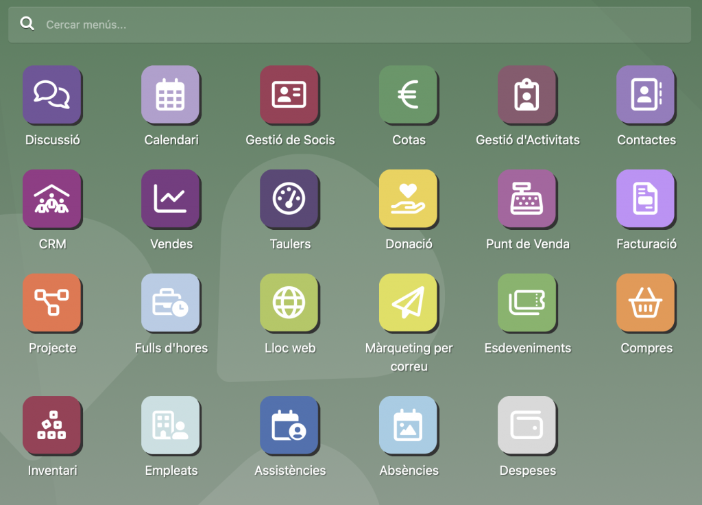 El menú d’aplicacions et mostra les icones de les aplicacions a les quals, amb el teu rol, disposes de permisos per a accedir. És per això que d’un usuari a un altre pot variar molt tot i estar a la mateixa instància de CreaERP.