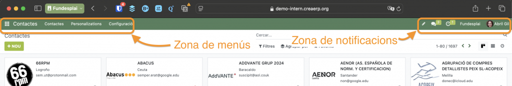 La barra de control és un element que, gairebé sempre, és visible a la part superior de la pantalla de CreaERP. Inclou dues zones, la zona de menús i la zona de notificacions.
