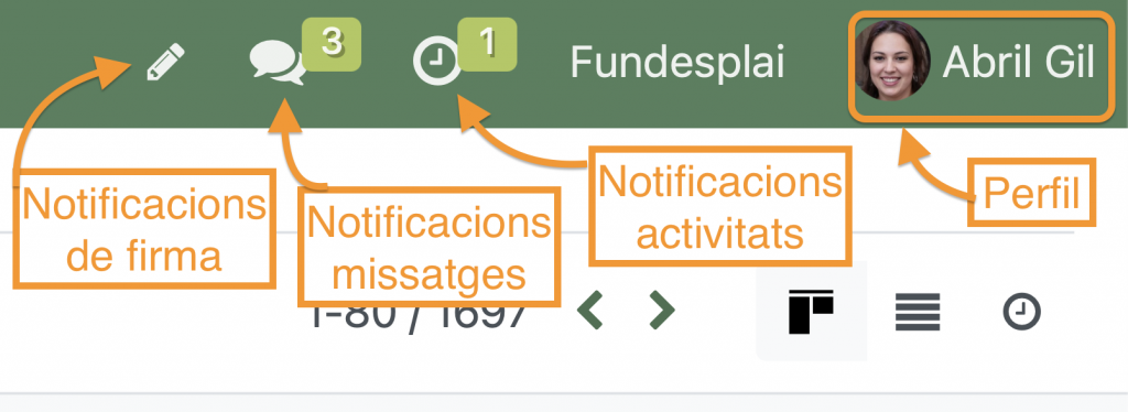 La zona de notificacions et dona accés a les notificacions de firma, missatges i activitats i al perfil del teu usuari.