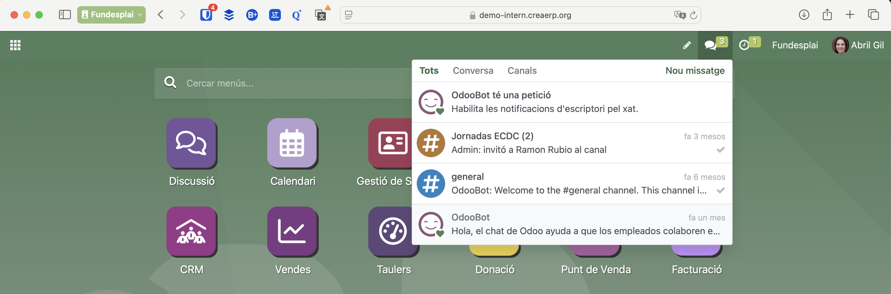 Notificacions de missatges. Si feu servir l’aplicació Discussió (enllaç a manual Discussió) o heu configurat al vostre perfil la recepció de les notificacions del sistema a CreaERP, aquí s’indicarà els missatges pendents de lectura i també podreu redactar un nou missatge de forma ràpida.