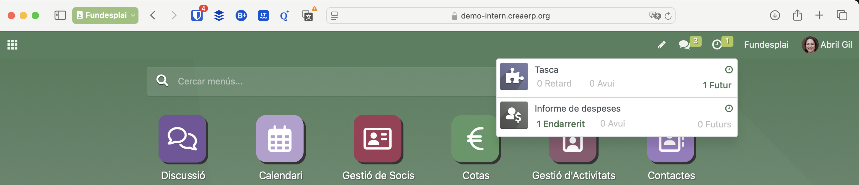 Notificacions d’activitat. Quan tenim assignades activitats (Veure Organitzar-se i col·laborar amb CreaERP) podràs accedir-hi des de la icona del rellotge. El número ens indicarà la quantitat d’activitats que han superat la seva data límit.