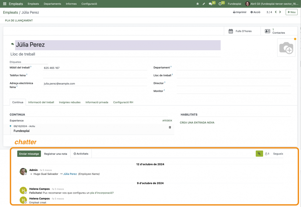 El chatter és l’eina de CreaERP que permet organitzar les teves tasques i col·laborar d’una forma efectiva amb la resta de companys de la teva organització. A més serveix com a registre cronològic de les modificacions i activitats de la fitxa de contingut vinculada. En funció de la mida de la teva pantalla trobaràs el Chatter a la part inferior o en el lateral dret de les fitxes de contingut de la major part dels models de CreaERP.