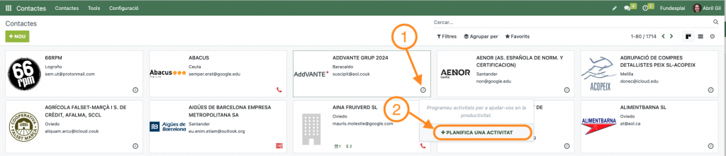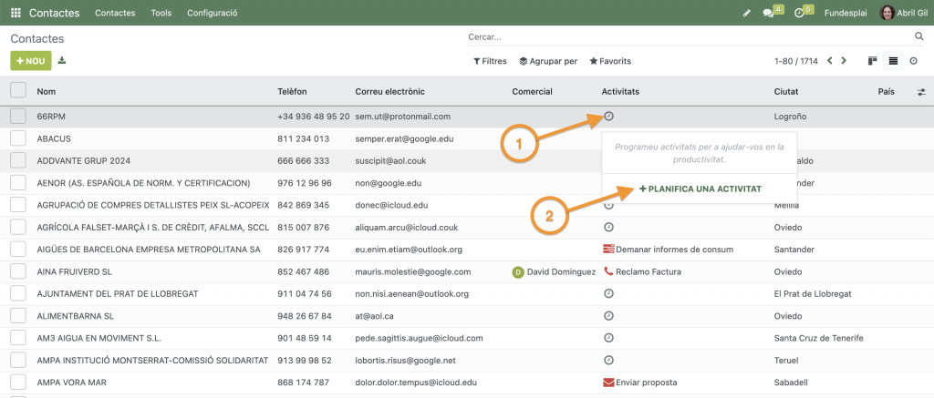 Localitza el registre en el qual vols programar una activitat. Mou-te per la fila per trobar el tipus d’activitat desitjat i fes clic al signe + (més). - Afegir una activitat a un contacte que no en té cap.
