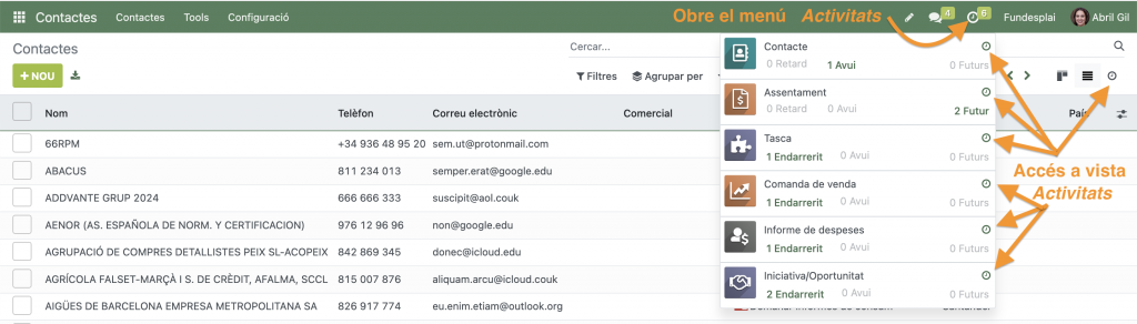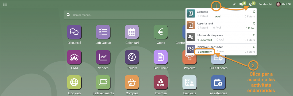Algunes aplicacions com Contactes, Projecte, Vendes o CRM disposen a la barra cerca d’una vista específica per a gestionar les activitats. També pots accedir a la vista Activitats des del menú Activitats a zona de notificacions de la barra de control on trobaràs el resum de les teves activitats programades.