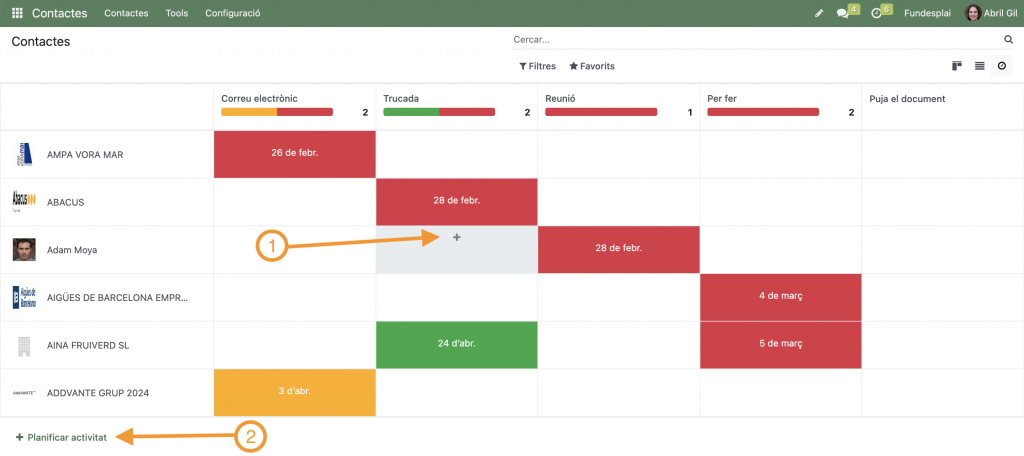 La vista d’activitats et mostra una taula en la qual a les files trobaràs els registres del model actiu (contactes, projectes, oportunitats…) i a les columnes els tipus d’activitat. Pots: