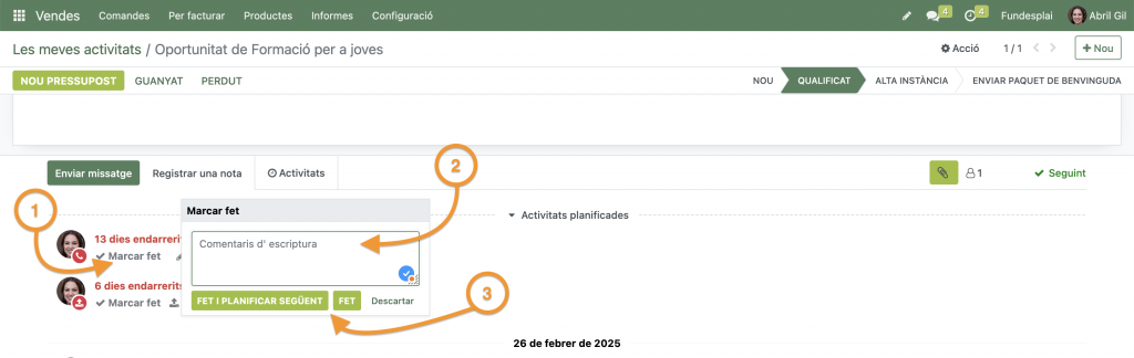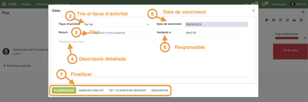 - Fet i planificar el següent, marca la tasca com a feta en aquest moment i obre una finestra per a generar una activitat nova.